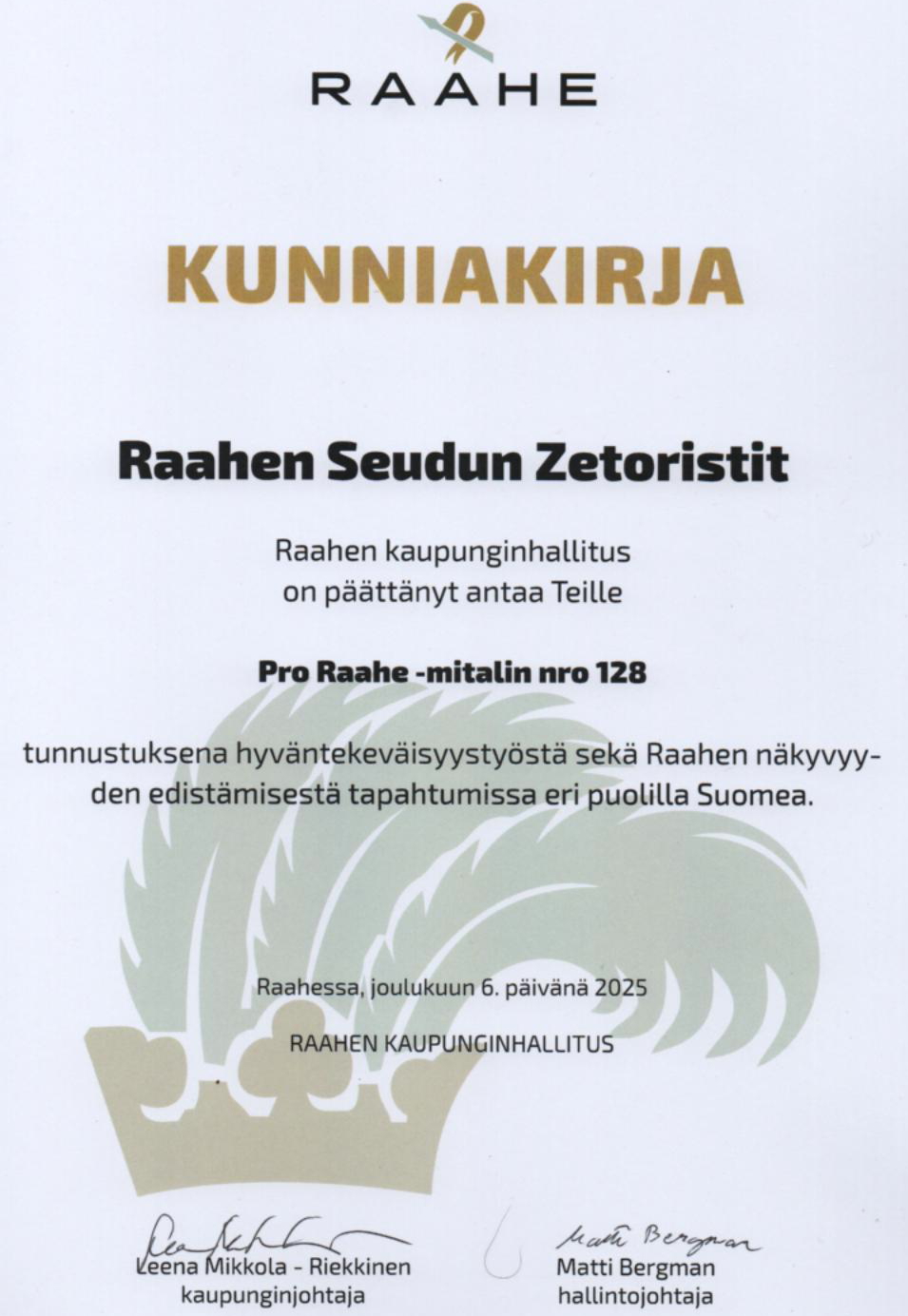 Saimme tänään korkeimman tunnustuksen Raahen kaupungilta työstämme Raahen seudun Zetoristeina.